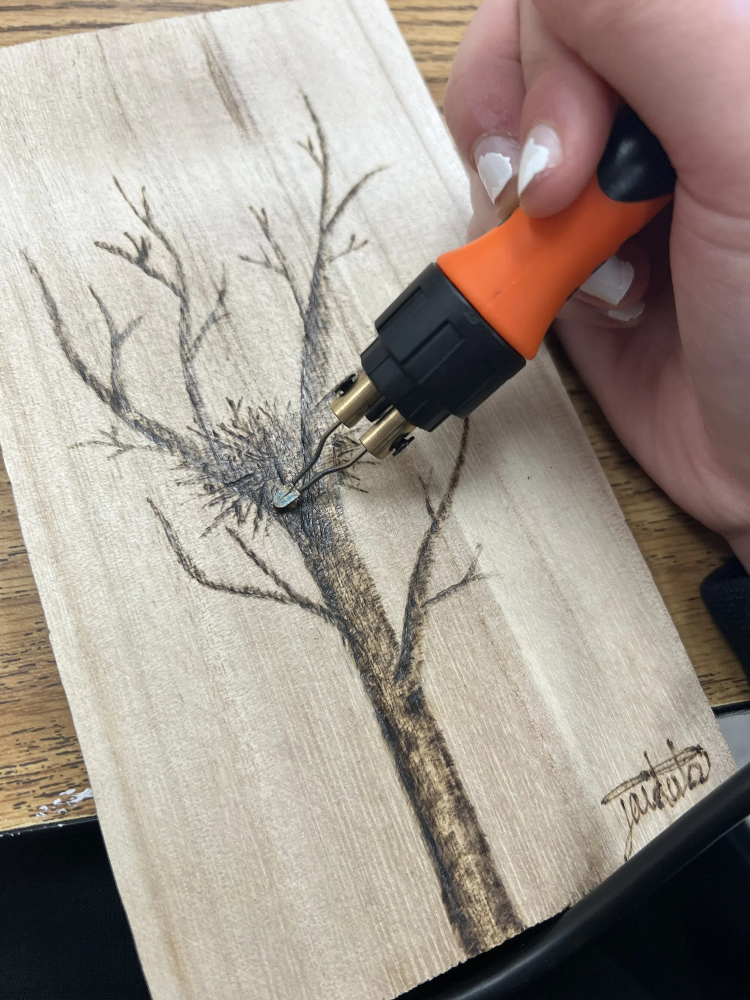 This wood-burned piece, “Home Between Horizons,” captures the quiet strength and unity of nature through the patient process of pyrography. As my very first wood-burning project, it took me a little over a week to complete, during which I also practiced techniques on a separate piece of wood to perfect my approach. I began by sketching the outline directly onto the raw wood slab, making sure to work with the natural grain and bark edges to keep the piece organic and true to its source. Using a wood-burning pen, I slowly built up each feather and branch with careful, layered strokes, bringing texture and depth to the bald eagles and their nesting tree. Each burn mark had to be deliberate — too much pressure or heat could scorch the wood too deeply, while too little would fade into the background. The result is a moment frozen in time: one eagle stands watch over the nest while the other soars freely above, a quiet testament to resilience, partnership, and the enduring wild.